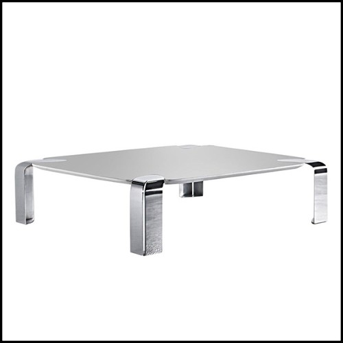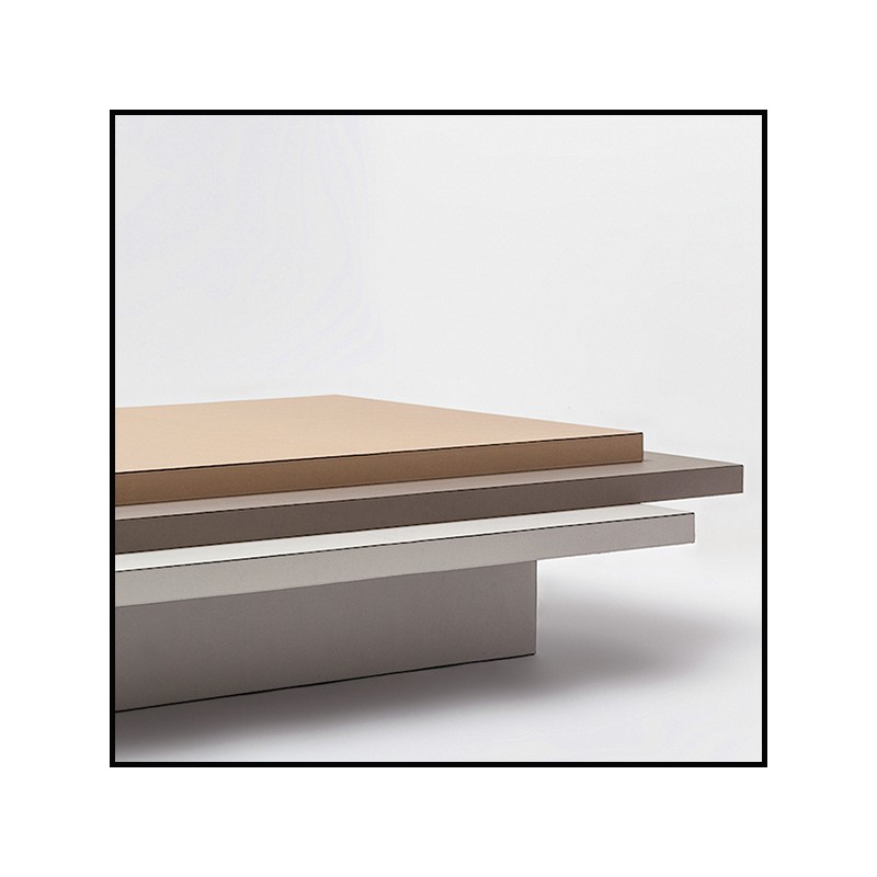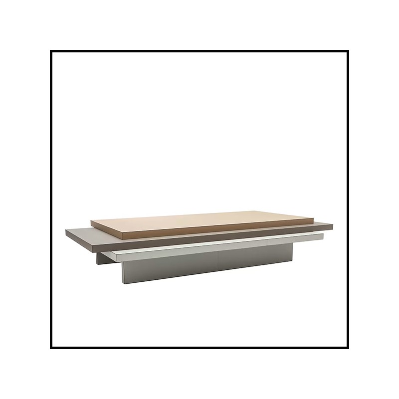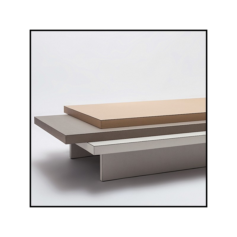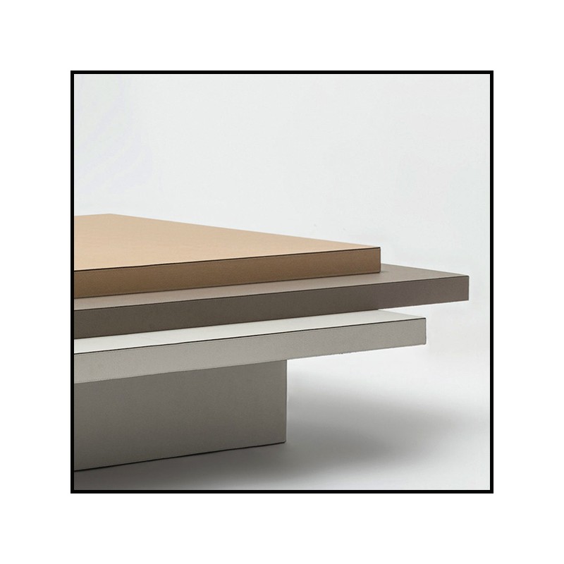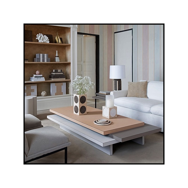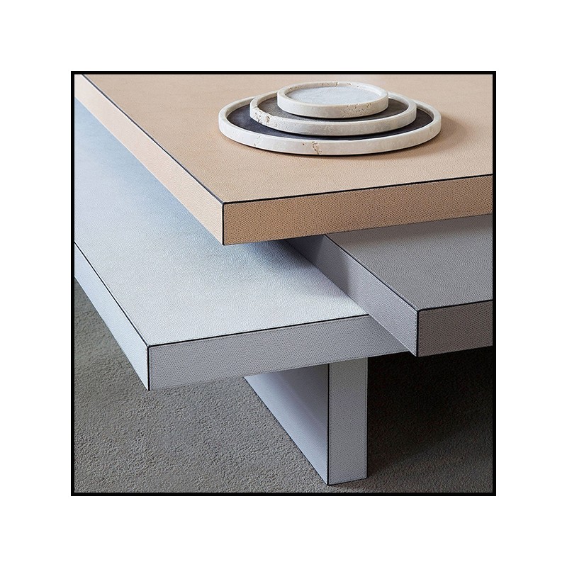Table basse Jedha présente une structure entièrement en bois massif couverte de cuir véritable grainé,