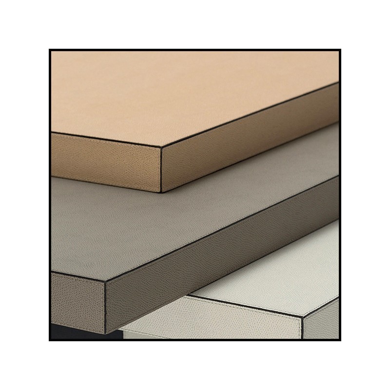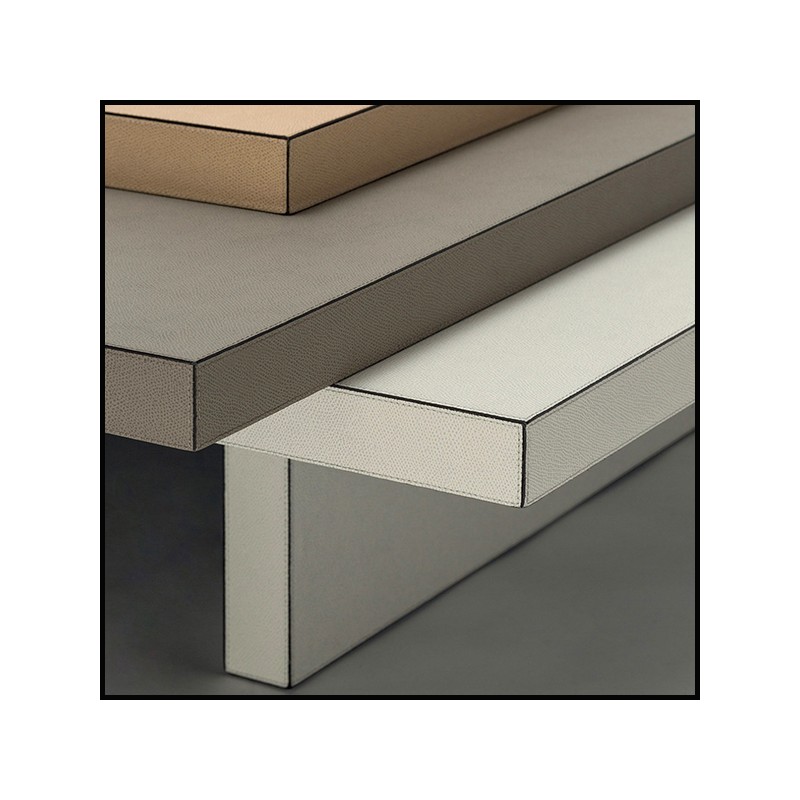 Le plateau supérieur est couvert de cuir brun, le plateau central est couvert de cuir gris et le plateau inférieur et la base sont couverts de cuir blanc.