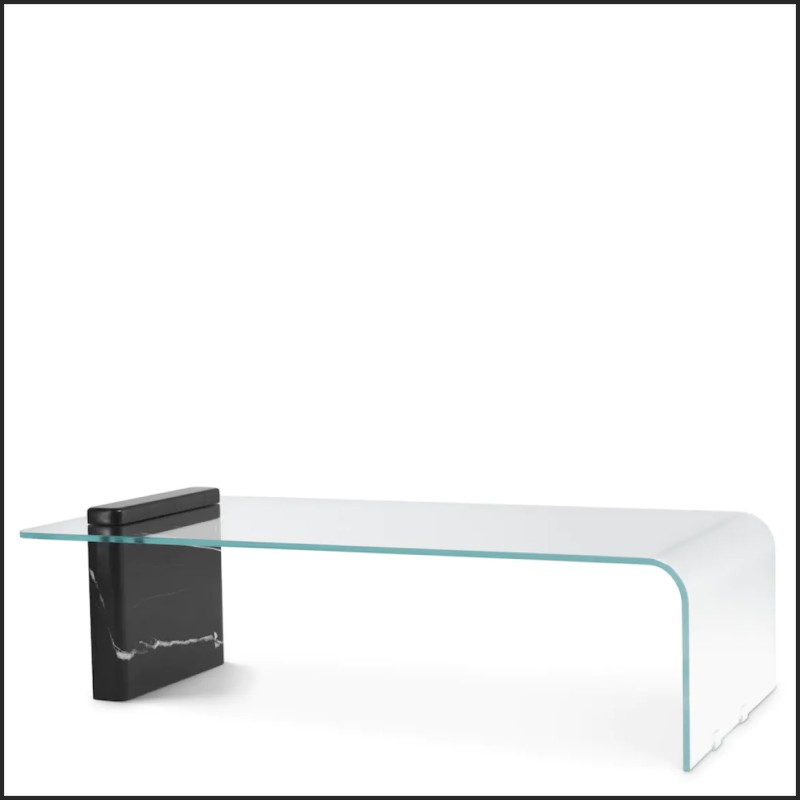 Cette table basse est dotée d'une base en marbre noir