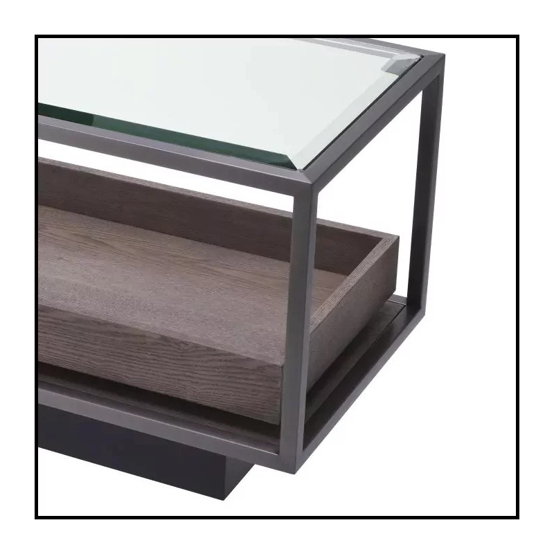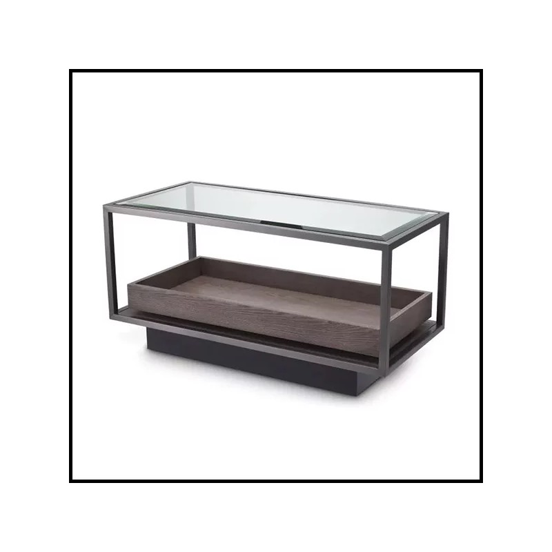 par un plateau en verre clair et une base noire moderne. Son plateau coulissant