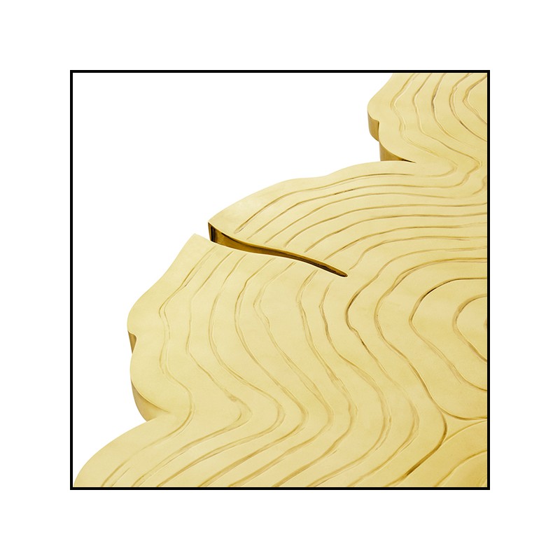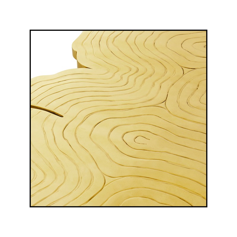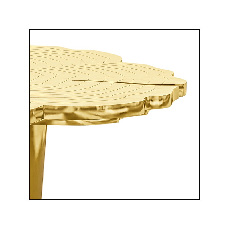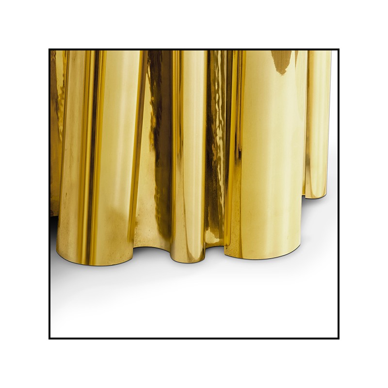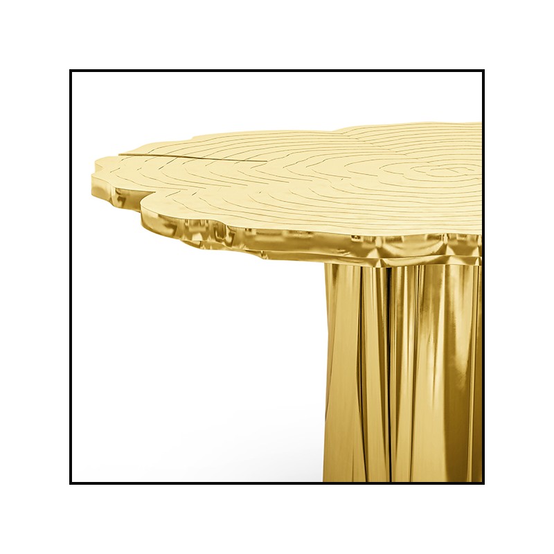 Table à manger Tresor Round présente une structure en bois recouverte de laiton massif poli.