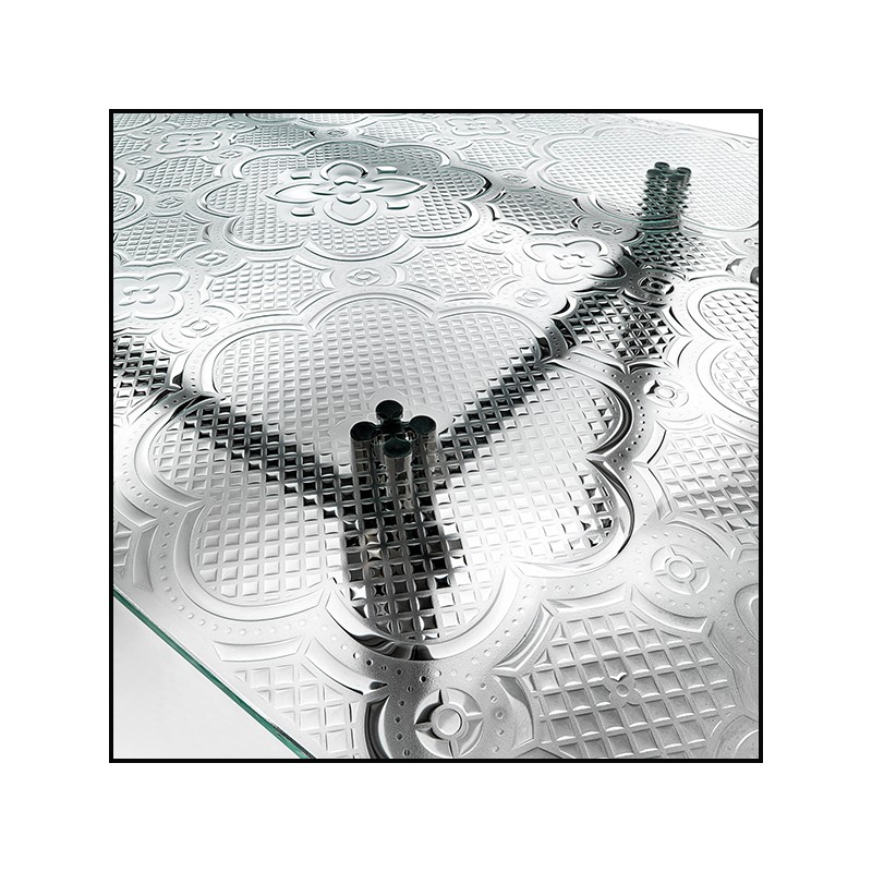 Plateau gravé en verre extra light de 15mm en fusion et trempé.