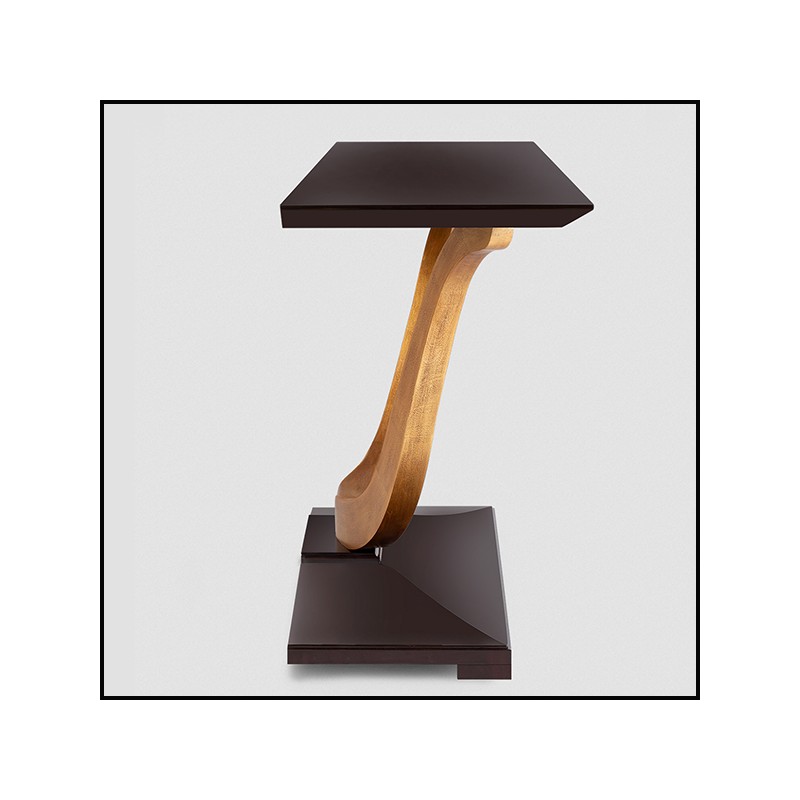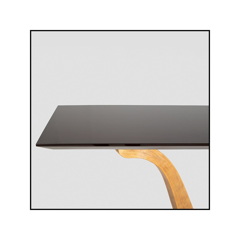 Le plateau de la table est en bois d'acajou plaqué, finition café.
