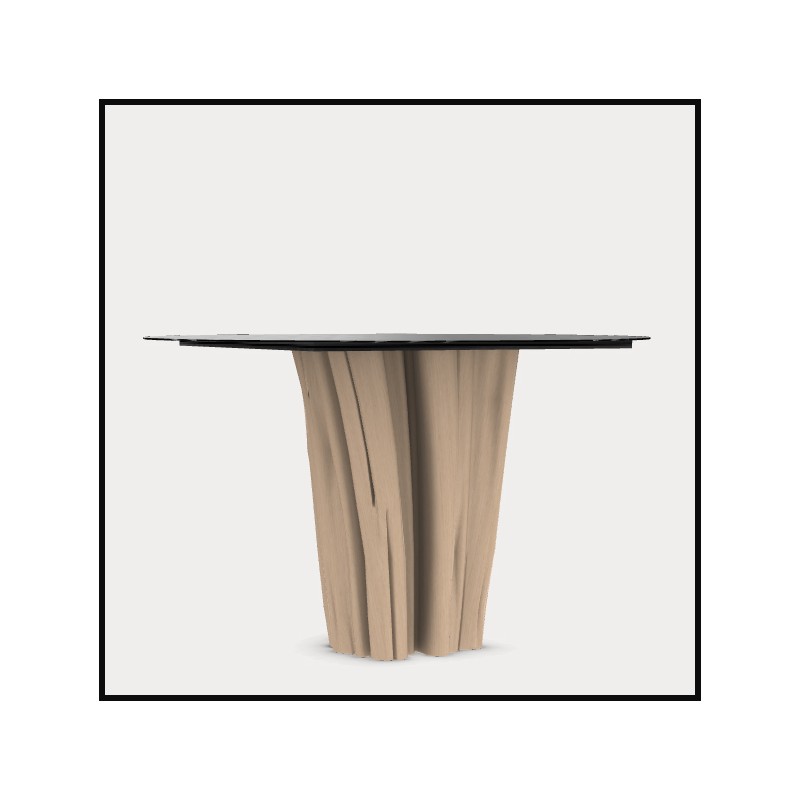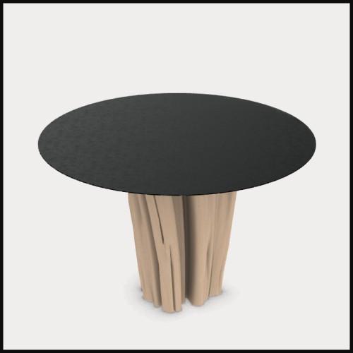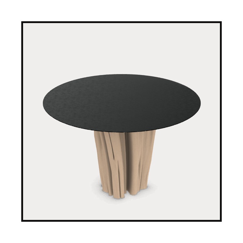 qui allie un piètement en charme naturel écorcé à un plateau rond en tôle