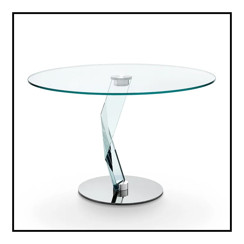 Table haute avec plateau en verre extra clair trempé, pied central en épaisseur 30mm, base en métal chromé.