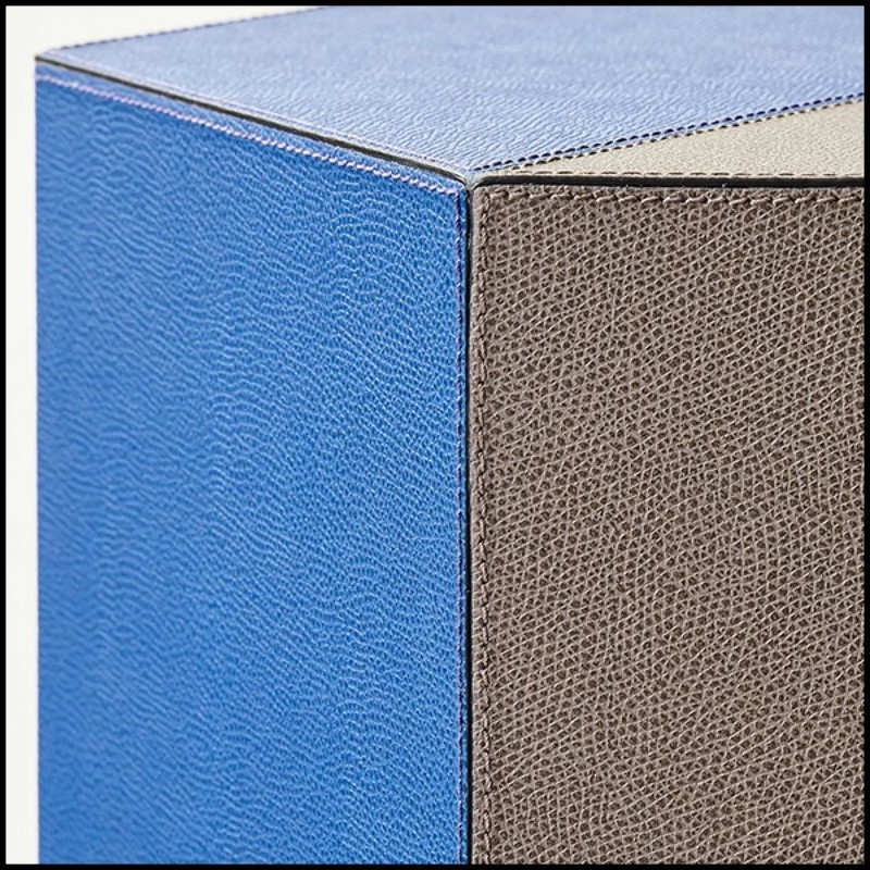 recouverte de cuir de veau artisanal de couleur bleue et marron.