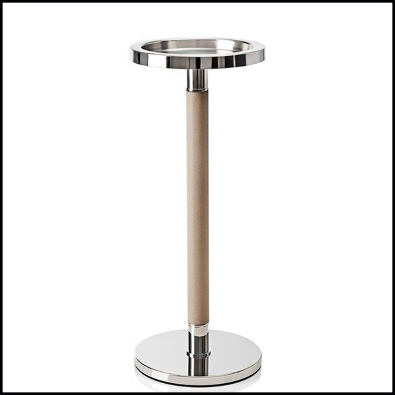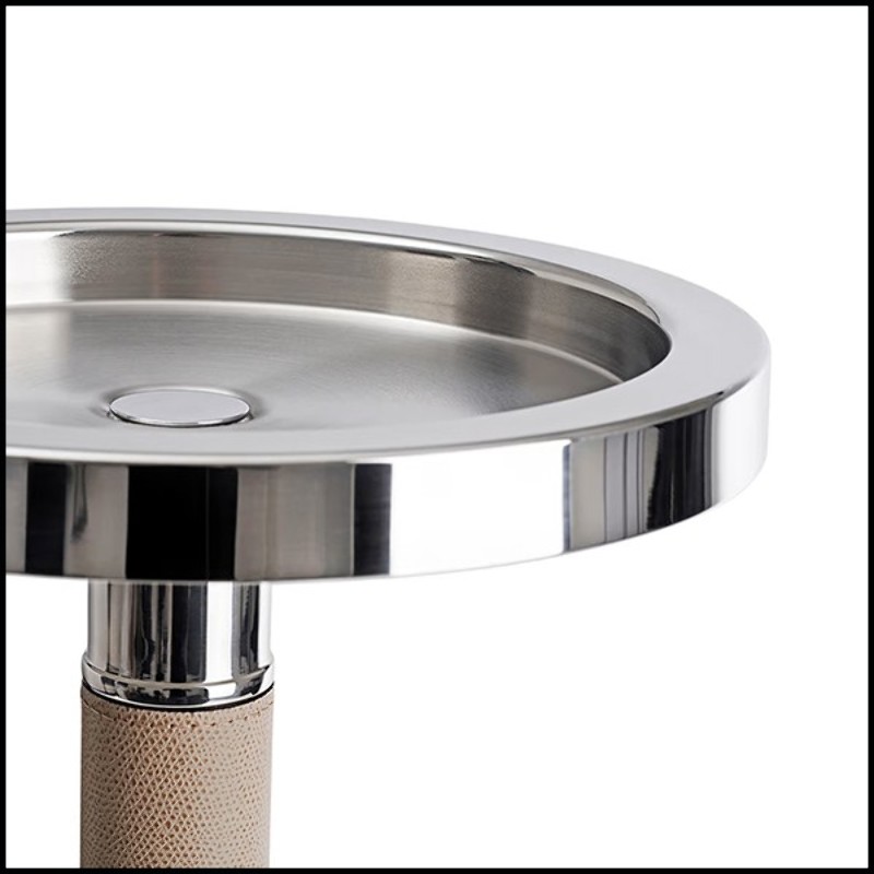 comprend un support en acier inoxydable poli couvert de cuir beige.